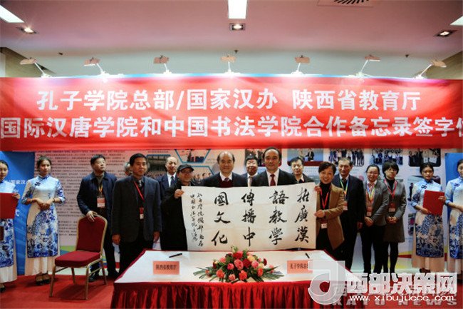 為更好的傳播中國傳統(tǒng)文化、推進教育資源共享,實現(xiàn)與孔子學(xué)院內(nèi)外互補的中國文化交流傳播格局。12日下午,孔子學(xué)院總部、國家漢辦、陜西省教育廳舉行了共建中國書法學(xué)院和國際漢唐學(xué)院的合作備忘錄簽字儀式。備忘錄由孔子學(xué)院總部、國家漢辦副總干事趙國成先生和陜西省教育廳副廳長劉建林先生共同簽署。簽字儀式由陜西省教育廳國際交流處副處長文通主持,國家漢辦和陜西省教育廳有關(guān)部門的領(lǐng)導(dǎo)以及我校黨委副書記、校長雷亞萍,西北大學(xué)副書記、副校長賈明德,中國書法學(xué)院院長于唯德,西安工業(yè)大學(xué)、西北大學(xué)有關(guān)部門的領(lǐng)導(dǎo)和師生代表參加了簽字儀式。
