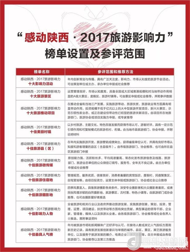 “感動(dòng)陜西·2017旅游影響力”大型評(píng)選活動(dòng),既是對(duì)2017年陜西旅游業(yè)的綜合評(píng)估和優(yōu)勢(shì)品牌項(xiàng)目的一次集中梳理和聯(lián)動(dòng)推廣,評(píng)選活動(dòng)設(shè)置了2017年“十大影響力活動(dòng)”、“十大旅游景區(qū)”、“十大旅游推動(dòng)力項(xiàng)目”、“十佳美麗村鎮(zhèn)”、“十佳旅游縣(區(qū))”、“十佳旅游微傳媒”、“十佳旅游住宿地”、“十佳旅游攝影地”、“十佳影響力人物”、“十佳最具人氣榜”10類項(xiàng)目,采取社會(huì)推薦、自主申報(bào)、專業(yè)推選、游客調(diào)查、網(wǎng)民評(píng)選、社會(huì)公示、大眾點(diǎn)評(píng)、數(shù)據(jù)分析等方法得出評(píng)選結(jié)果,于2018年1月通過大型盛典對(duì)外公布,使其成為載入史冊(cè)的2017年度陜西旅游業(yè)優(yōu)勢(shì)品牌榜單。