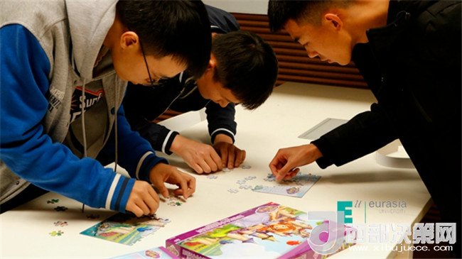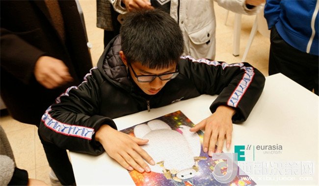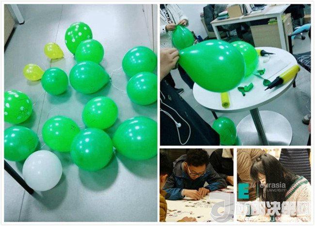 土豆和西紅柿根本就不是一個(gè)世界的,但它們走到了一起,變成了薯?xiàng)l和番茄醬它倆就是絕配;學(xué)籍制度和競(jìng)技運(yùn)動(dòng)也不是一個(gè)世界的,但它們?nèi)诤显诹艘黄?,變成了頭腦風(fēng)暴和趣味運(yùn)動(dòng)它們也可以很般配,現(xiàn)在就讓我們來看看它們是怎么融合的……聽那陣陣氣球爆炸的聲音,他們開始了!在這些綠油油的氣球中有事先設(shè)置的題目隊(duì)員們要先擠爆氣球答完題才能得到下一個(gè)地方的線索,“補(bǔ)考成績(jī)不合格以及成績(jī)低于50分必須怎樣?”“本科選修課學(xué)分不得低于多少學(xué)分?”這些題是不是還要開動(dòng)腦袋瓜仔仔細(xì)細(xì)的想想才有答案呢?在比賽的現(xiàn)場(chǎng)一秒都會(huì)和對(duì)手拉開差距,容不得一絲猶豫拿到線索的隊(duì)員們又奔向下一個(gè)地點(diǎn)熟悉的教室,這里也不是那么容易通過,看著黑板上的題“冰怎么很快的化成水?”“可替代大學(xué)英語(yǔ)四級(jí)成績(jī)的考試有哪些?”哦,還有計(jì)算題,隊(duì)員們必須腦洞大開,腦細(xì)胞飛速運(yùn)轉(zhuǎn),做學(xué)霸那也是不容易的。只見黑板上粉筆一起一落,答題完畢,看看線索迅速趕往下一地點(diǎn)——地中海。這里指壓板、跳繩早已準(zhǔn)備好等著隊(duì)員們,學(xué)霸不能只管學(xué)習(xí)身體素質(zhì)也很重要,動(dòng)起來吧!在指壓板上跳繩,誰想出來的?忍受著腳底的疼痛還要揮動(dòng)跳繩?太受虐,但是我們是一群不屈不撓的新一代,指壓板上跳繩我們也是鏗鏘有力、一絲不茍。終于結(jié)束痛并快樂著的跳繩環(huán)節(jié),卻看到了整整400塊的拼圖,這個(gè)環(huán)節(jié)真是讓人又愛又恨,還記得兒時(shí)玩拼圖的快樂,但在這激烈的競(jìng)爭(zhēng)環(huán)境下,卻是讓人有點(diǎn)心慌和畏懼。隊(duì)員們最終齊心協(xié)力戰(zhàn)勝了它,細(xì)心、耐心的逐一完好的拼完了每一副圖。