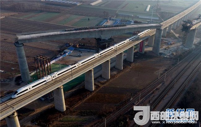 西成高鐵由西安北站駛出的列車經(jīng)過(guò)西成高鐵跨西寶高鐵特大橋(12月6日攝)。12月6日,西安至成都高速鐵路全線開通運(yùn)營(yíng),兩地的最短旅行時(shí)間壓縮至4小時(shí)7分。