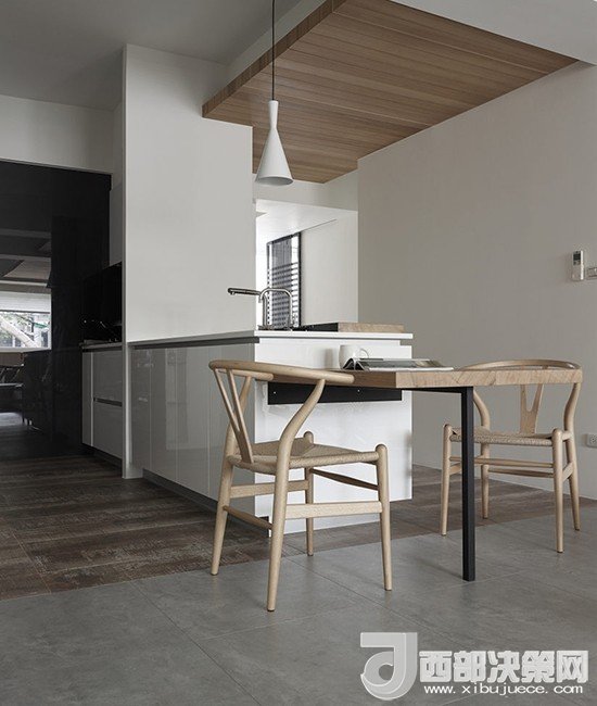 將洗手臺(tái)放在中間的位置,配上組合的簡易餐桌,不做吧臺(tái)的設(shè)計(jì)也能滿足開放式的需求,在家下廚較少的業(yè)主可以考慮。