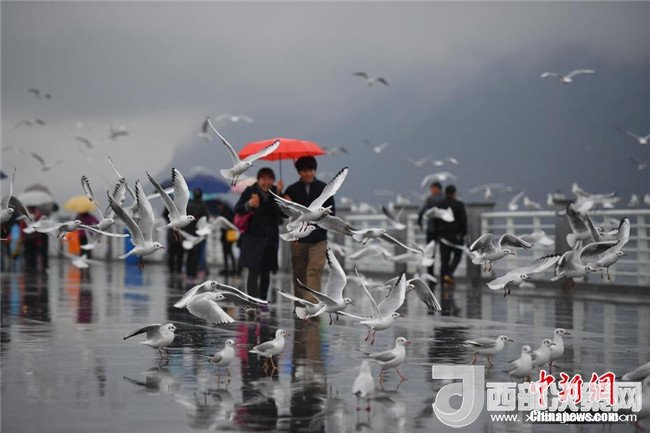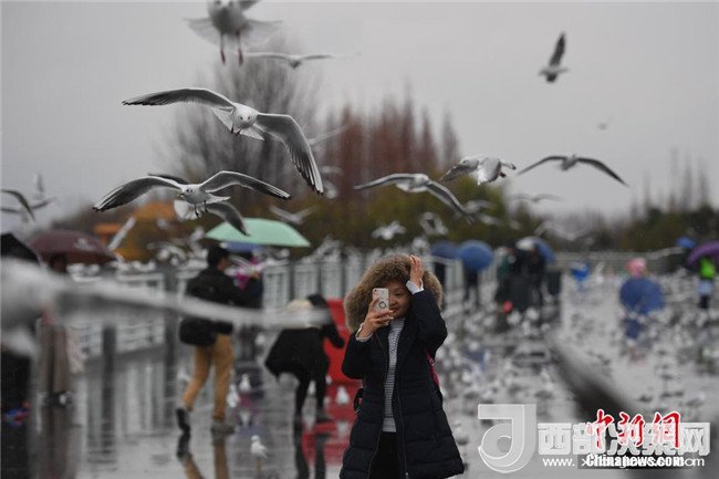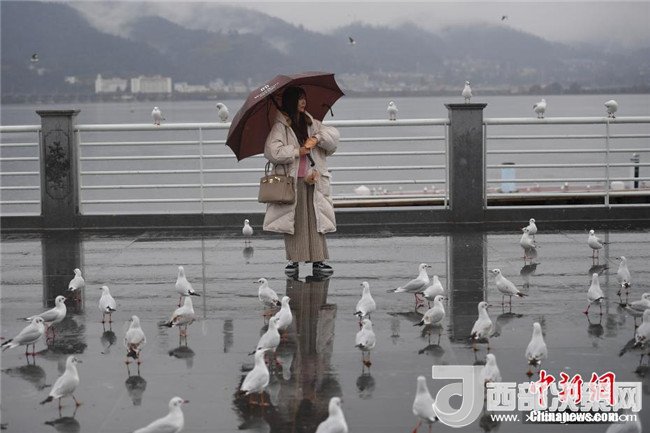 1月3日,紅嘴鷗在滇池邊與游客親密接觸。當日,“春城”昆明淅淅瀝瀝的小雨下個不停,仍有眾多游客和市民來到滇池邊,與西伯利亞的“白色精靈”——紅嘴鷗相會,領略昆明別樣美景。(記者 劉冉陽 攝)