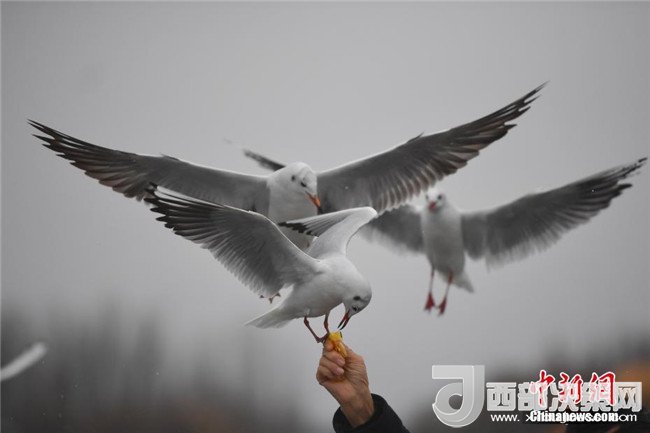 1月3日,一只紅嘴鷗站在游客手上吃食。(記者 劉冉陽 攝)