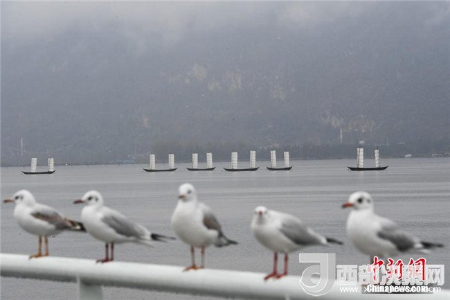 1月3日,排排站的紅嘴鷗與遠處的帆船相應成趣。(記者 劉冉陽 攝)