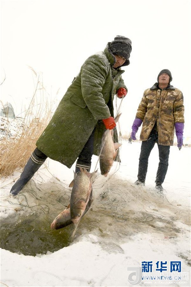 1月6日,在內蒙古杭錦后旗鴻雁湖,捕魚人展示捕撈上來的魚。(支茂盛 攝)