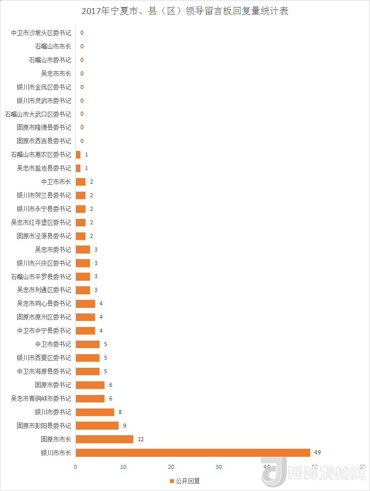 銀川市市長(zhǎng)以49條回復(fù)量高居榜首,是第二名固原市市長(zhǎng)回復(fù)量的三倍多。