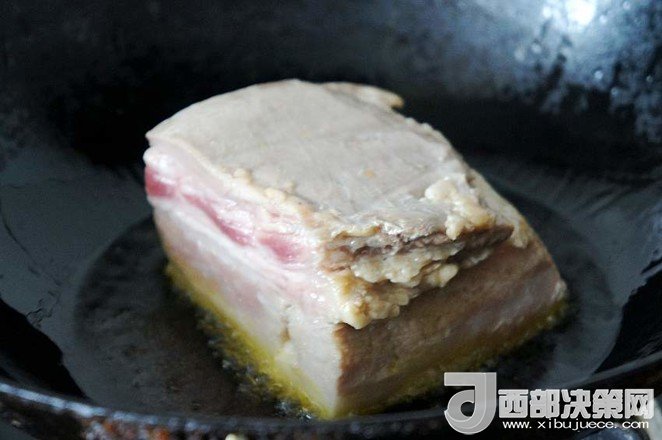 7.慢慢煎至五花肉肉皮呈深紅色,肉塊的周?chē)布逯两瘘S色