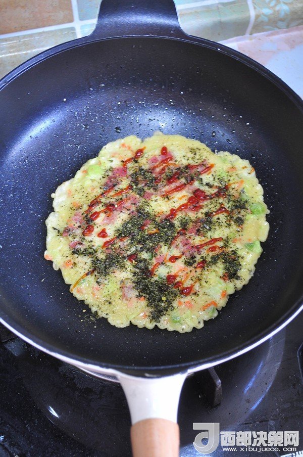 10.再把面餅翻過來,擠上番茄醬,撒上海苔粉。