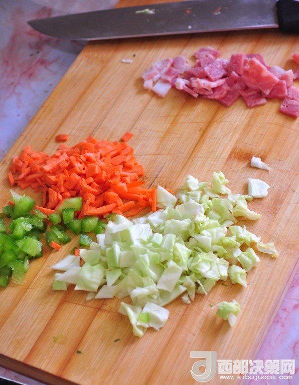 1.將胡蘿卜、青椒、包菜、培根切丁備用。
