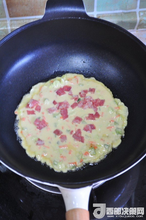 8.將培根撒上,小火慢慢煎,煎至表面基本凝固。