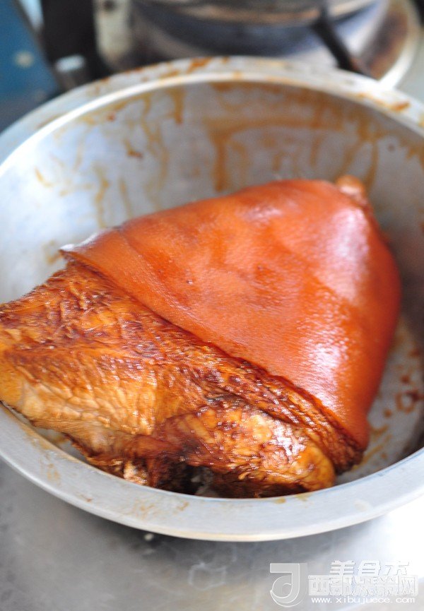2.把肘子撈出,表面抹上老抽,這是上色的關(guān)鍵