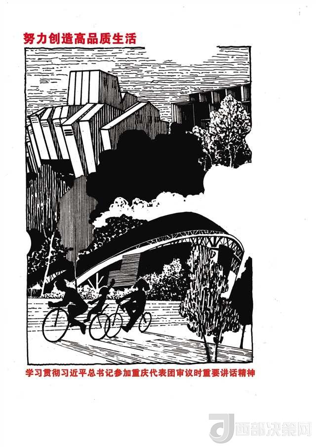 另一組負(fù)責(zé)“創(chuàng)造高品質(zhì)生活”的師生也遭遇類似的問題。最初師生們想用一組市民在公園鍛煉的場(chǎng)景來闡述這個(gè)主題,但很快就發(fā)現(xiàn)這樣的畫面太簡單蒼白。最終,他們將重慶大劇院、重慶美術(shù)館、奧體中心等重慶的標(biāo)志性建筑作為文化符號(hào)列入畫稿中,才有了令人耳目一新的感覺。