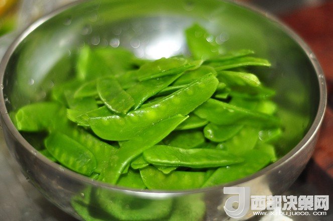 5.水燒開,加點油和鹽,把荷蘭豆下入焯燙斷生。撈出過涼。這樣更綠。