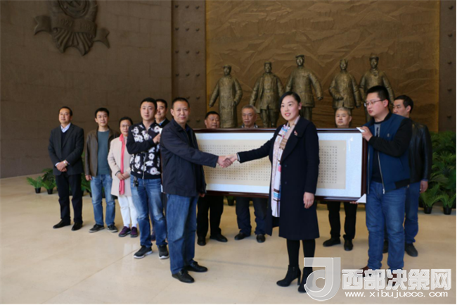 西部決策網(wǎng)——西部大開發(fā)訊(帥華鋒 通訊員 柴金霞 陳彥榮)“三月的南梁,大地處處蕩漾著春的漣漪.....”在這生機勃勃、春意盎然的美好時節(jié),中國書法家協(xié)會會員、首屆《世界華人運動大會書畫展》楷書評委、清心齋主人趙倉老師一行,帶著對革命老區(qū)的深情厚誼和對劉志丹、謝子長、習(xí)仲勛等革命先輩舍生忘死、救民出水火的崇敬之意來到革命圣地——南梁,向紀念館捐贈書法作品《長恨歌·習(xí)仲勛》。本作品系趙倉老師艱辛創(chuàng)作的佳品力作,飽含了趙倉老師豐厚的文化內(nèi)涵,真實再現(xiàn)了習(xí)仲勛老人不畏艱難、矢志堅守的人生壯麗詩篇。