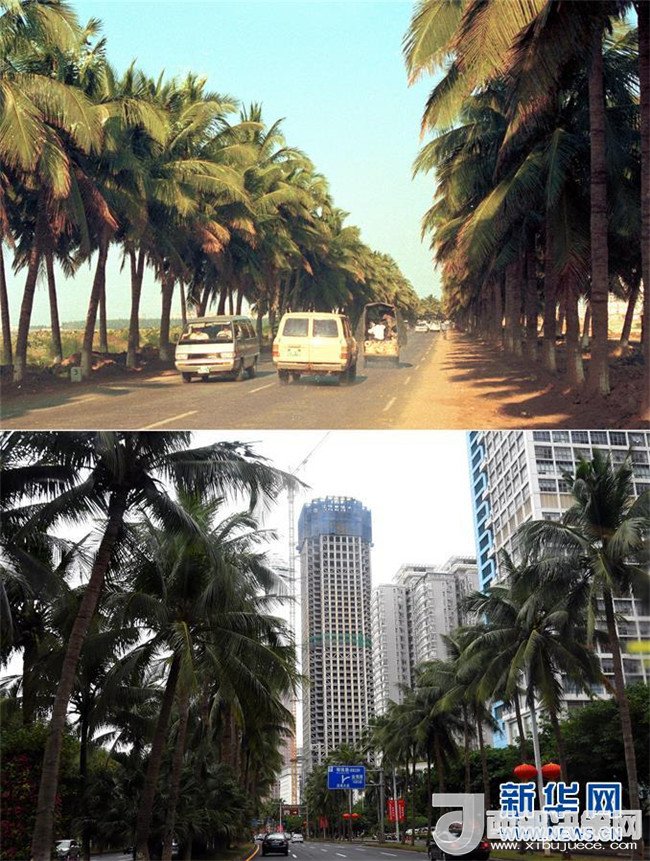 拼版照片為??谑袨I海大道今昔對(duì)比(上圖為1990年1月10日新華社記者姜恩宇攝,下圖為2018年4月15日新華社記者趙穎全攝)。