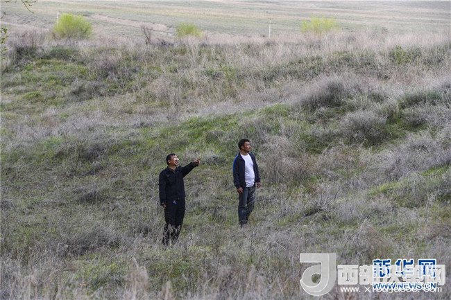 新疆霍城四爪陸龜國家級(jí)自然保護(hù)區(qū)管理局工作人員林世忠(左)和護(hù)林員伊力扎提·伊麻木在保護(hù)區(qū)內(nèi)巡查(4月15日攝)。