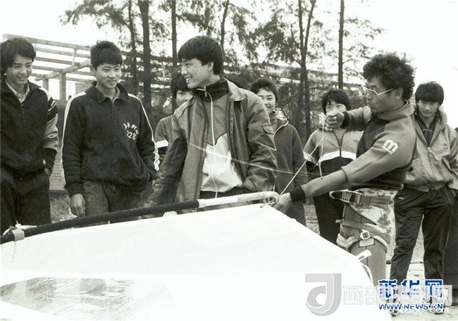 來自臺灣的帆板運動員在海口和當地群眾交流(1989年1月16日攝)。新華社記者 姜恩宇 攝