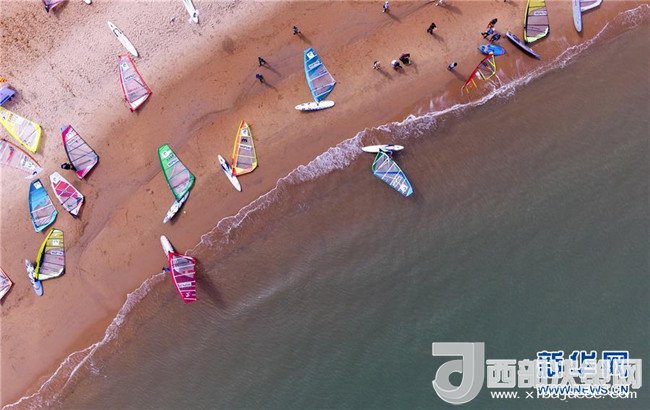 參加2017第四屆國際旅游島帆板大獎賽海口大獎賽的選手在比賽結束后上岸(2017年11月16日無人機拍攝)。新華社記者 楊冠宇 攝