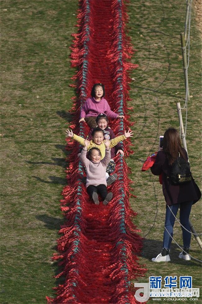 小朋友在湖州市吳興區(qū)妙西鎮(zhèn)原鄉(xiāng)小鎮(zhèn)體驗滑草(3月10日攝)。