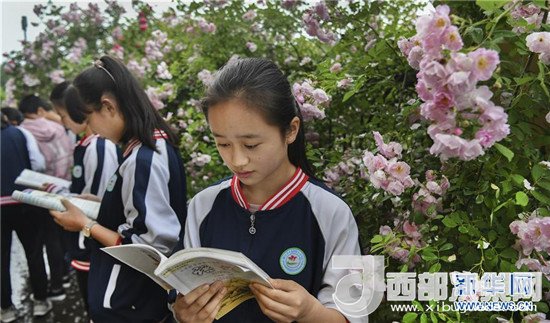 木魚中學(xué)的學(xué)生們?cè)谛@的鮮花叢中閱讀課文(4月24日攝)。