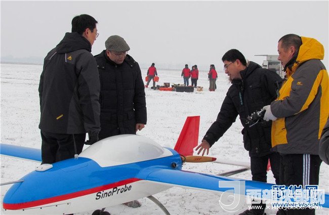 黃大年(左二)及團隊成員在極寒天氣下進行固定翼無人機試飛(2013年1月20日攝)。
