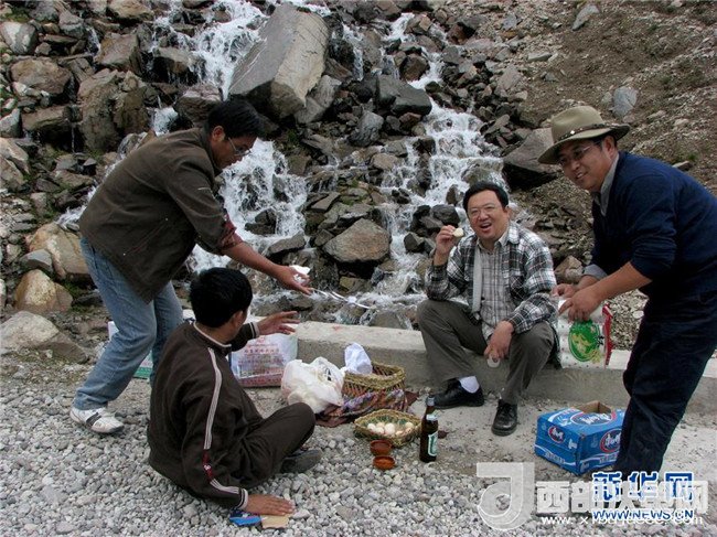 鐘揚(右二)與西藏大學(xué)師生在西藏采集種子時在戶外吃午飯(2007年8月21日攝)。