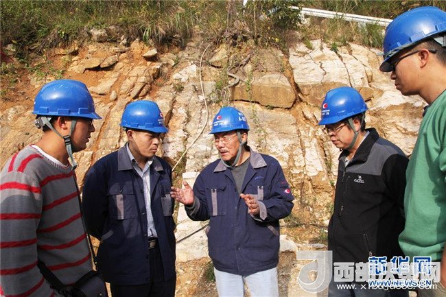 南仁東(左三)與工程技術(shù)人員在大窩凼施工現(xiàn)場檢查施工進展(2014年12月1日攝)。