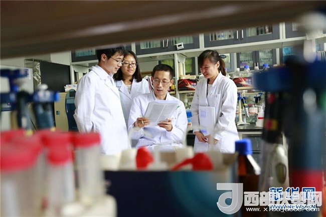 施一公(右二)與團隊成員討論文章細節(jié)(資料照片)。