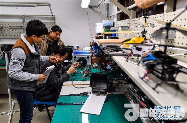黃大年團隊成員在實驗室內(nèi)調(diào)試、組裝無人機(2017年2月9日攝)。