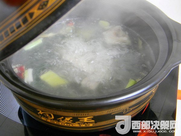 3.砂鍋放水,水的量掌握好,放入排骨,姜,辣椒和胡椒粉。