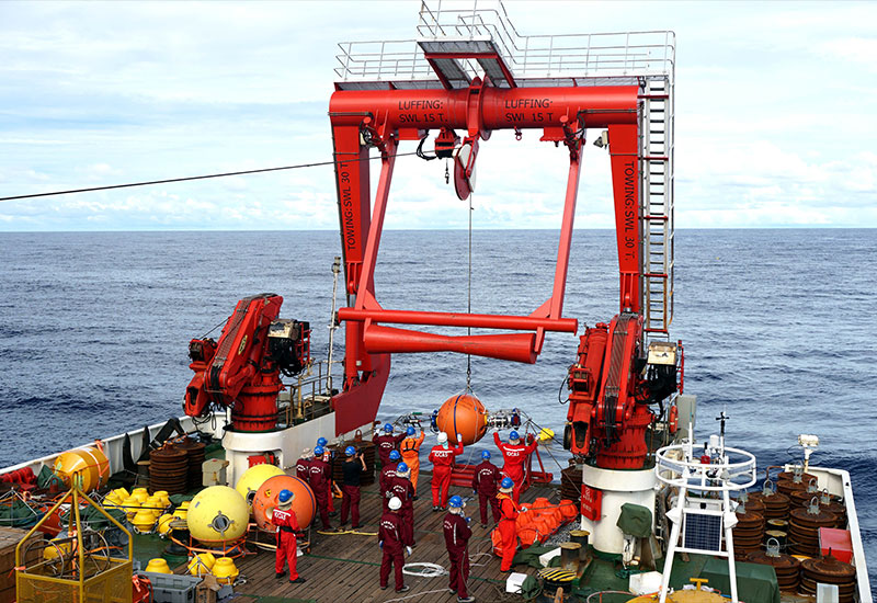在我國新一代海洋綜合科考船“科學(xué)”號上,科考隊員正在布放潛標(2017年12月10日攝)。新華社記者 張旭東 攝