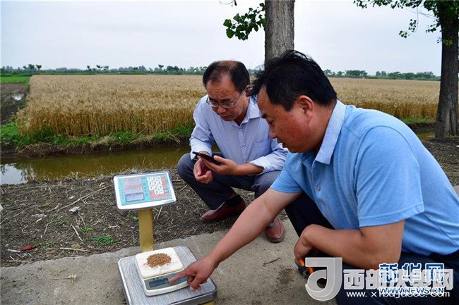 5月29日,在河南省鄧州市腰店鎮(zhèn)國家雜交小麥項目制種基地,工作人員將田間隨機多點取樣的小麥稱重。