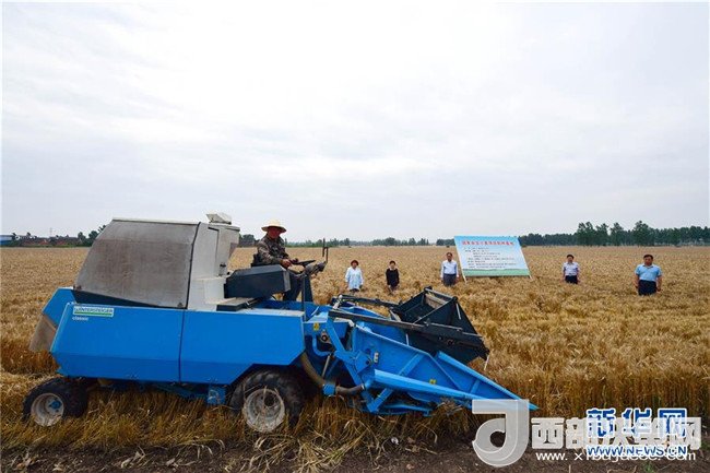5月29日,在河南省鄧州市腰店鎮(zhèn)國家雜交小麥項目制種基地,收割機正在收割小麥。