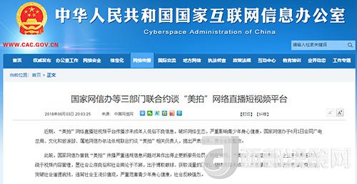 北京6月4日電據(jù)國家網(wǎng)信辦官網(wǎng)消息,近期,“美拍”網(wǎng)絡直播短視頻平臺傳播涉未成年人低俗不良信息,破壞網(wǎng)絡生態(tài),嚴重影響青少年身心健康。國家網(wǎng)信辦于6月1日會同廣電總局、文化和旅游部、屬地網(wǎng)信辦依法依規(guī)聯(lián)合約談“美拍”相關(guān)負責人,提出嚴肅批評,責令全面整改。