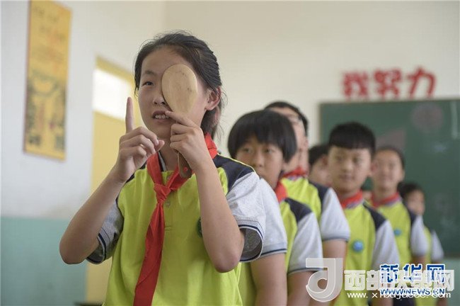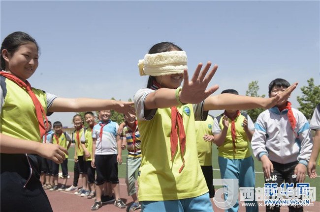 6月5日,廊坊市安次區(qū)仇莊鄉(xiāng)大王務(wù)中心小學(xué)學(xué)生在操場上體驗蒙眼行進(jìn),通過游戲的方式感受保護(hù)視力的重要性。