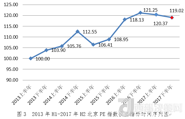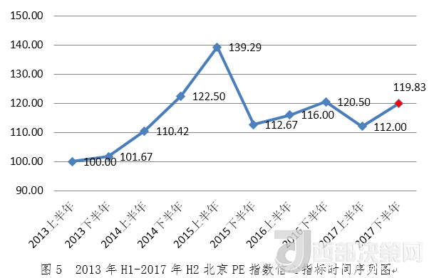 2017年下半年北京PE指數(shù)為120.25,環(huán)比增長1.18%,同比下降3.03%。從指數(shù)走勢看,2017年下半年北京PE指數(shù)較上半年穩(wěn)步回升,仍處于高位。