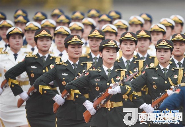 6月6日下午,國家主席習近平在人民大會堂東門外廣場舉行儀式,歡迎吉爾吉斯斯坦總統(tǒng)熱恩別科夫?qū)χ袊M行國事訪問。這是在歡迎儀式上首次增加的三軍儀仗隊女兵方陣。新華社記者 陳曄華 攝