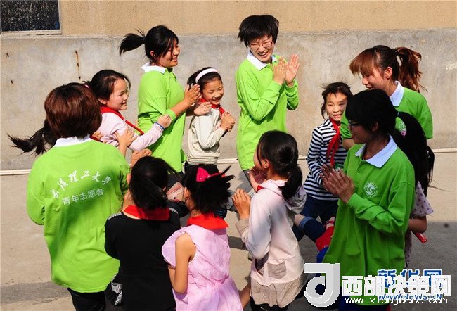 2011年4月28日,武漢理工大學(xué)研二學(xué)生郎坤和農(nóng)民工子弟學(xué)校武漢凌智小學(xué)的孩子們一起在屋頂平臺(tái)上做游戲。新華社記者 程敏 攝