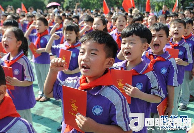 在2017年5月26日安徽省亳州市譙城區(qū)風(fēng)華小學(xué)舉行的入隊(duì)儀式上,孩子們?cè)谛x入隊(duì)誓詞。新華社發(fā)(張延林 攝)