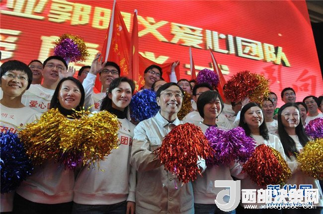 在2012年3月4日舉行的“中央企業(yè)郭明義愛心團(tuán)隊(duì)”授旗儀式現(xiàn)場(chǎng),郭明義與愛心團(tuán)隊(duì)合影。新華社發(fā)(胡慶明 攝)