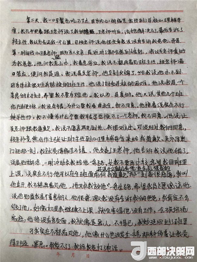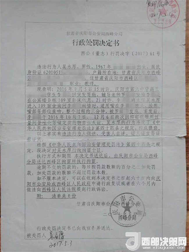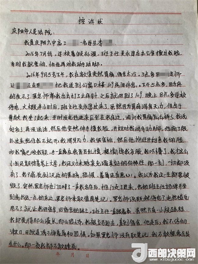 孩子叫李某奕,1999年4月出生,原慶陽(yáng)六中高三(二)班學(xué)生,平時(shí)活潑開(kāi)朗,勤奮好學(xué),成績(jī)?cè)诎嗉?jí)前列。然而,噩夢(mèng)從2016年9月開(kāi)始了。2016年9月5日下午,當(dāng)時(shí)正在慶陽(yáng)六中讀高三的李某奕突然胃疼,因?yàn)樗奚岜容^冷,被老師安排在教師公寓休息。晚上8點(diǎn)半左右,班主任吳某厚以探病為由進(jìn)入女兒休息的房間,詢(xún)問(wèn)過(guò)后便開(kāi)始摸臉、親吻、咬耳朵、摟抱李某奕,后因安排她休息的老師進(jìn)房間取東西才停止。此后她心里就有了陰影。她先找到學(xué)校心理輔導(dǎo)老師哭訴了自己的遭遇,心理輔導(dǎo)老師解決不了,又告訴了政教主任段老師。交談中段主任得知孩子的訴求是不想見(jiàn)到這位涉事老師,就答應(yīng)其要求。并肯定了孩子沒(méi)告訴家長(zhǎng)是對(duì)的。