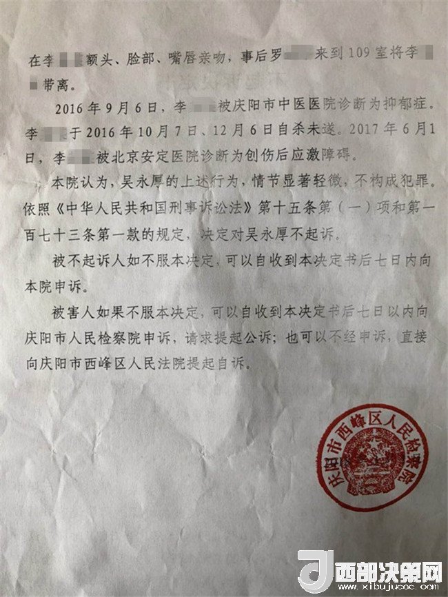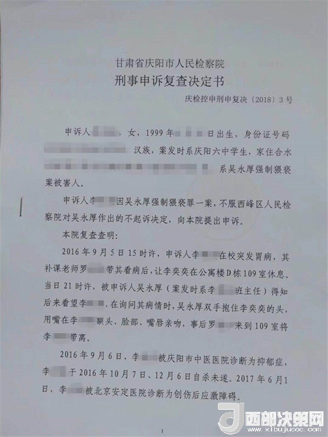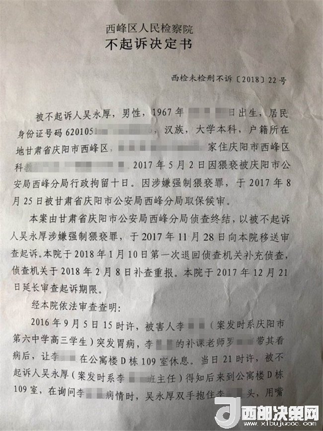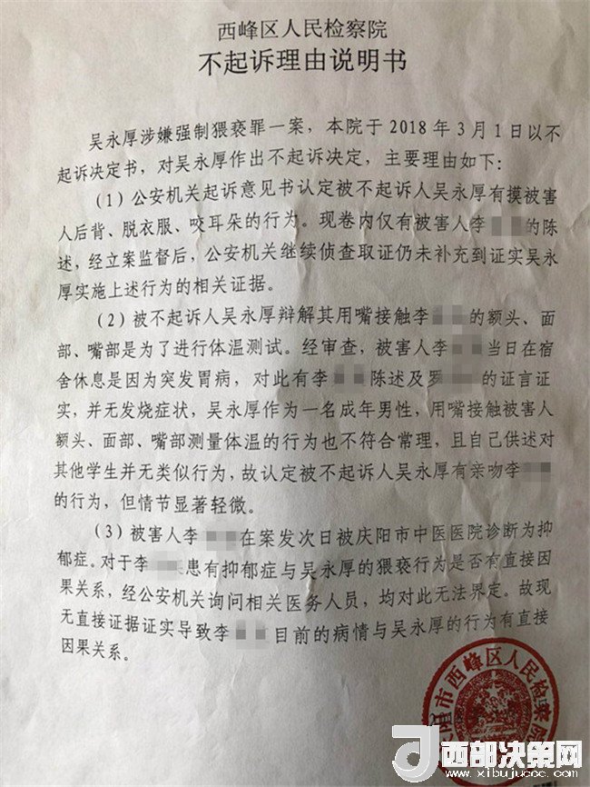 2017年2月26日,李某奕在父親陪同下到公安機(jī)關(guān)報(bào)案,稱(chēng)被其班主任吳某厚猥褻,要求查處。經(jīng)辦案部門(mén)調(diào)查,2017年5月2日,公安機(jī)關(guān)依據(jù)《中華人民共和國(guó)治安管理處罰法》第四十四條之規(guī)定,以猥褻行為對(duì)吳某厚處以行政拘留十日處罰。其間,李某奕父親認(rèn)為公安局處罰不當(dāng),到西峰區(qū)人民檢察院進(jìn)行申訴。區(qū)檢察院調(diào)閱案卷后認(rèn)為吳某厚的行為涉嫌犯罪,書(shū)面通知公安局立案?jìng)刹椤9簿钟?017年8月10日立為刑事案件。8月25日對(duì)吳某厚采取取保候?qū)彺胧?1月20日偵查終結(jié)后移送起訴至區(qū)檢察院。區(qū)檢察院審查后認(rèn)為吳某厚的行為“情節(jié)顯著輕微,不構(gòu)成犯罪”,“決定對(duì)吳某厚不起訴”,并出具《不起訴理由說(shuō)明書(shū)》。提出不起訴的三個(gè)理由,包括“公安機(jī)關(guān)繼續(xù)偵查取證仍未補(bǔ)充到吳某厚實(shí)施上述行為的相關(guān)證據(jù)”、“吳某厚有親吻李某奕的行為,但情節(jié)顯著輕微”、“無(wú)直接證據(jù)證實(shí)導(dǎo)致李某奕目前的病情與吳某厚的行為有直接因果關(guān)系”,于2018年3月1日作出不起訴決定。李某奕遂到慶陽(yáng)市人民檢察院進(jìn)行申訴。5月18日,市檢察院維持區(qū)檢察院不起訴決定。6月25日晚,據(jù)李某奕父親講,他已將申訴材料寄至甘肅省人民檢察院。