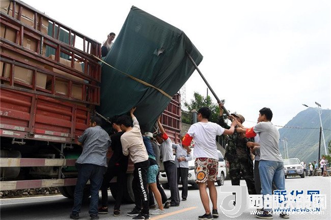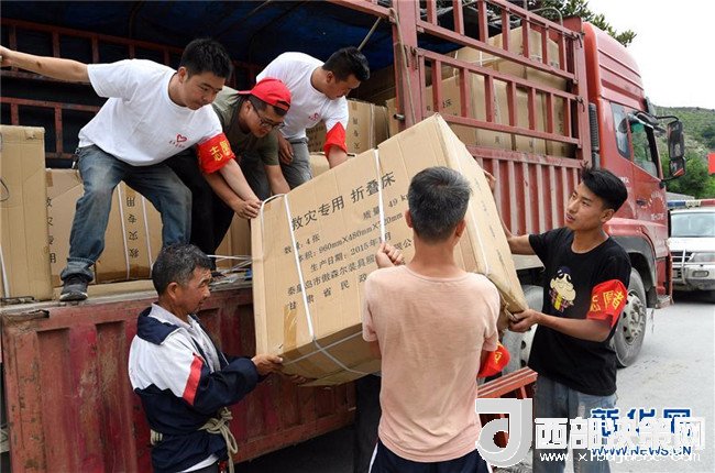 7月15日,在舟曲縣南峪鄉(xiāng),志愿者及村民從車(chē)輛上搬運(yùn)救災(zāi)物資。