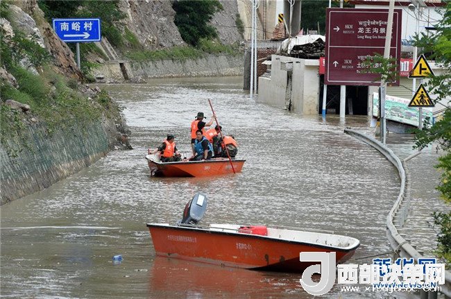 7月15日,在舟曲縣南峪鄉(xiāng),工作人員乘坐沖鋒舟開(kāi)展險(xiǎn)情處置。