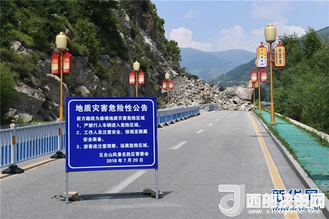 這是五臺(tái)山景區(qū)管委會(huì)在梵仙山路段山體崩塌現(xiàn)場設(shè)置的警示牌(7月21日攝)。受降雨影響,山西五臺(tái)山景區(qū)于7月19日和20日發(fā)生兩起山體崩塌地質(zhì)災(zāi)害,沒有造成人員傷亡和車輛損失。新華社發(fā)(楊晨光攝)