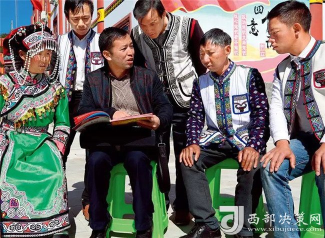 貴州省六盤(pán)水市鐘山區(qū)大灣鎮(zhèn)海嘎村駐村第一書(shū)記楊波(前左二)向海嘎村彝族村民宣講十九大精神 劉續(xù)攝/ 本刊