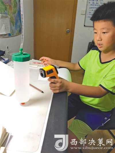 首先設(shè)計(jì)一個(gè)裝置,下部寬大的容器盛水,上部細(xì)長的管子可以觀察水的體積變化。然后將裝滿水的容器放入冰箱冷凍層,形成冰水混合物,此時(shí)水溫接近零攝氏度。最后將容器取出,用手持式測溫儀測量水溫……這一系列步驟,不是實(shí)驗(yàn)室里進(jìn)行的專業(yè)研究,而是南京師范大學(xué)附屬小學(xué)四年級學(xué)生徐子越和王美澄正在做的暑假作業(yè),他們通過觀察水的體積隨溫度的變化,來解釋冰為什么會(huì)浮在水面上。