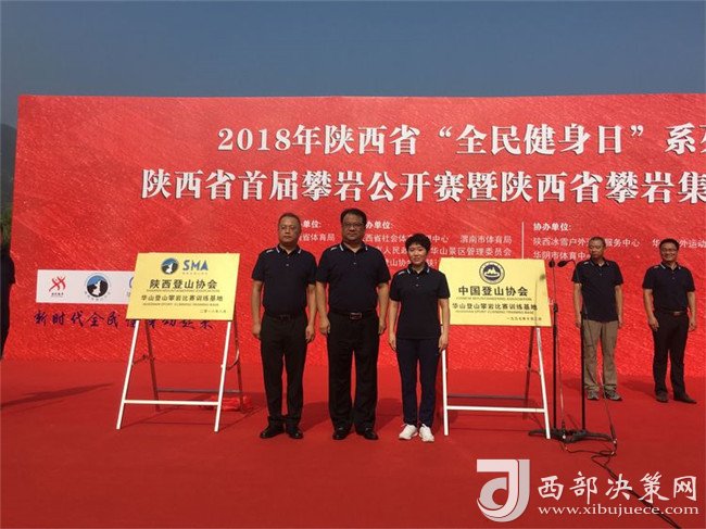 隨后陜西省登山協(xié)會主席陳錚向省攀巖集訓隊教練組代表邱洪樹授“陜西省攀巖集訓隊”隊旗,并頒發(fā)聘書。陜西省社會體育管理中心主任田凱、渭南市體育局副局長王曉燕、陜西華山旅游集團有限公司副總經(jīng)理趙江峰同志共同為“陜西省攀巖訓練基地”揭牌。