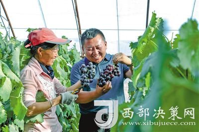 村民劉喜梅、郭翠蓮和姐妹們有說有笑地摘著大串葡萄,發(fā)自內(nèi)心的喜悅洋溢在臉上。“過去,就種點(diǎn)地靠天吃飯,趕上好年景,辛辛苦苦在地里一年忙到頭,人均收入不到1000元?,F(xiàn)在我們不用頂著烈日看天吃飯了,在棚里摘葡萄、修枝剪葉,每月就掙3000到4500多元,這是做夢都想不來的好事。這得感謝黨的好政策!感謝王萬斌!”劉喜梅高興地說。
