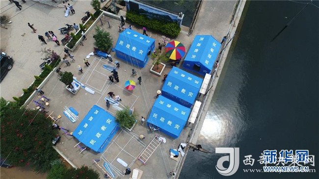 通??h四街鎮(zhèn)中搭起的救災(zāi)帳篷(8月13日無人機拍攝)。